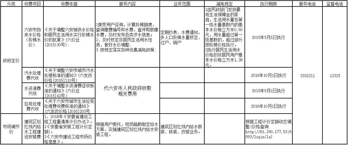 4、根據(jù)六安市發(fā)改委、財(cái)政局、城管局《關(guān)于調(diào)整六安市城市污水處理標(biāo)準(zhǔn)的通知》(六發(fā)改價(jià)格[2016]110號(hào))文件,?自2016年10月1日起調(diào)整我市污水處理費(fèi)價(jià)格。